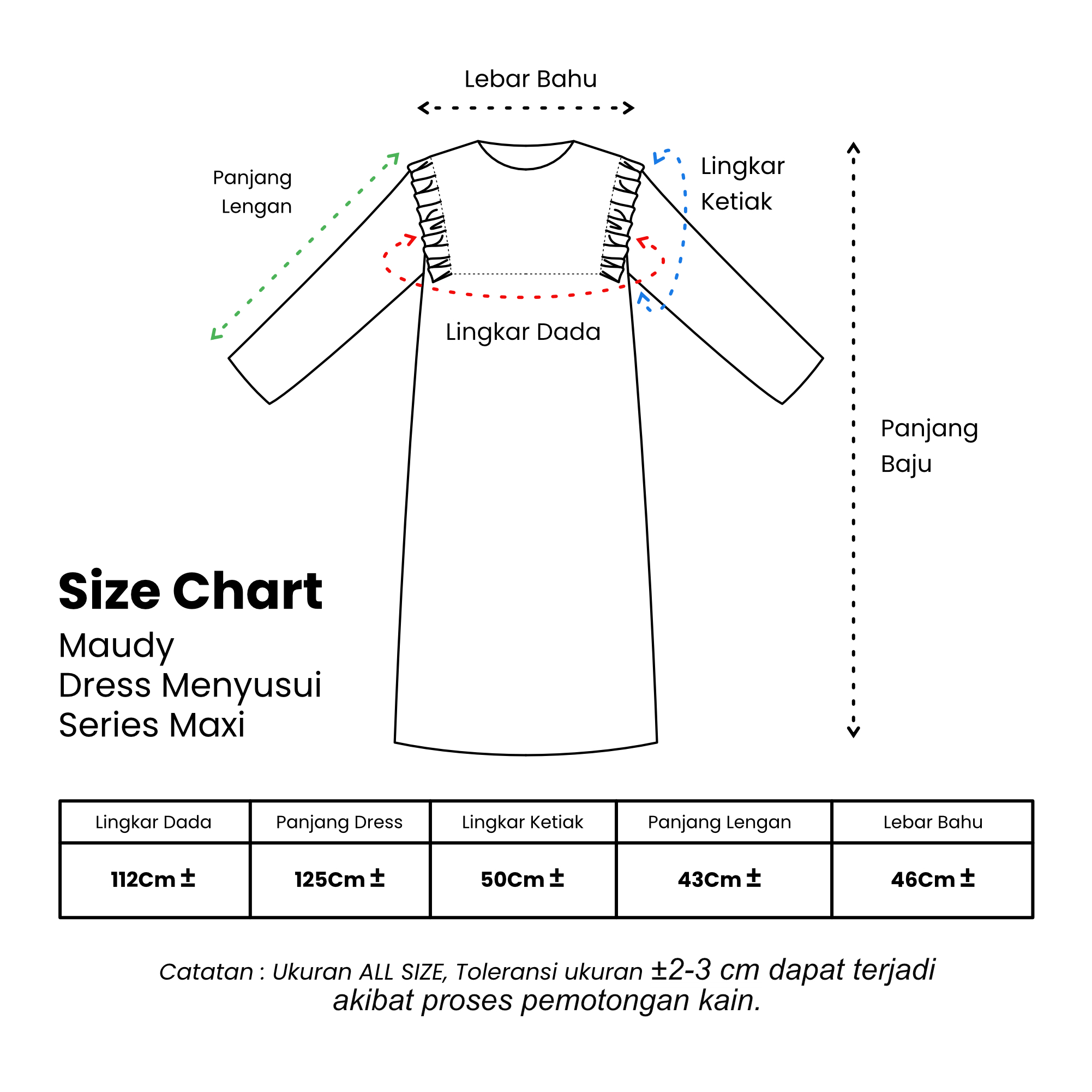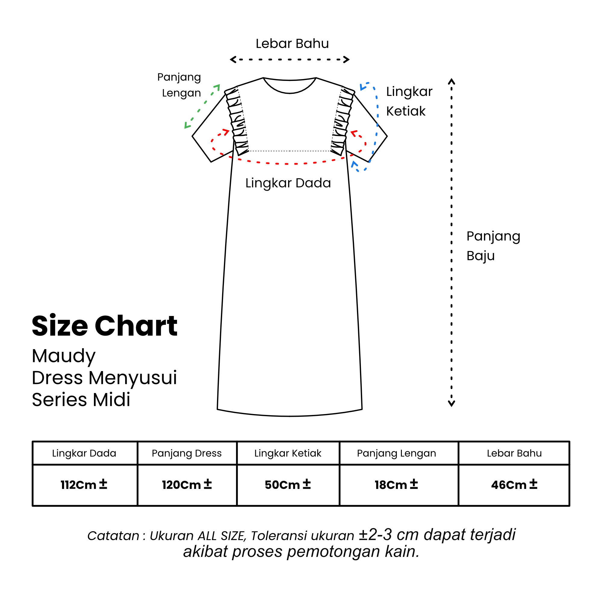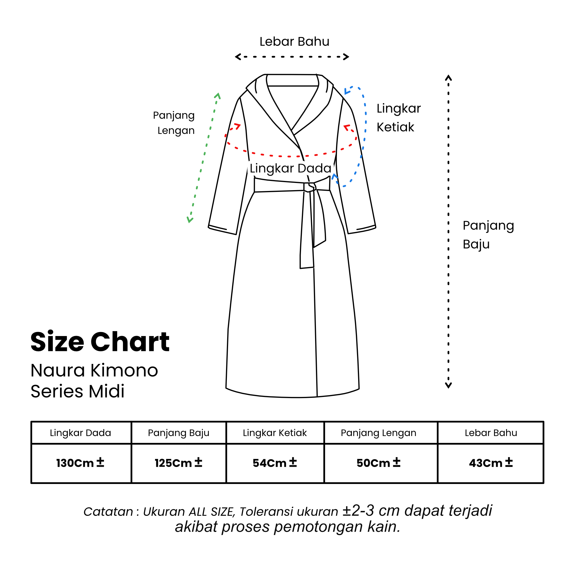 NB: Toleransi ukuran 2-3 cm dapat terjadi karena proses produksi dan pemotongan.